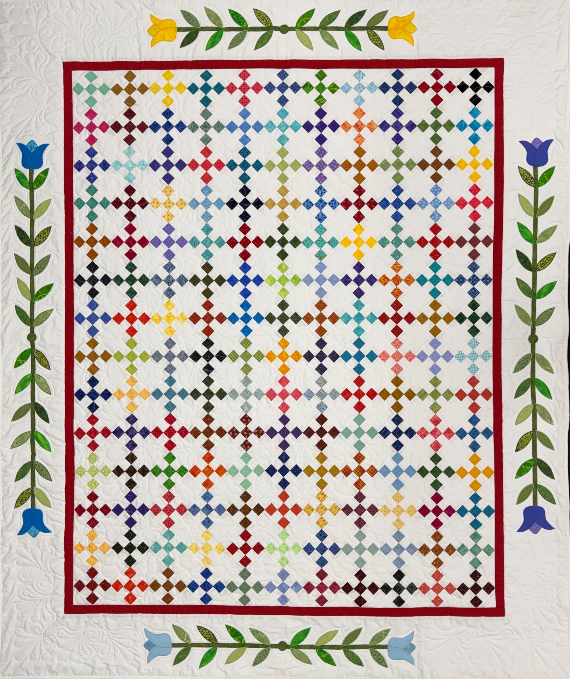 The 2026 Tulip Time Committee raffle quilt, Tulip Patch, was designed by Sally Leep and Cheryl Zylman. The quilt was made using individual squares of bright and vibrant fabrics and sewn into 9-patch blocks by Sally Leep. The borders of tulips were made using cotton and batiks, and it was machine appliquéd by Cheryl Zylman using a satin stitch. Birtles Fabrics of Zeeland machine quilted the quilt using a tulip design. The binding was completed by Cheri Aardema. The quilt is approximately 62”x74”.